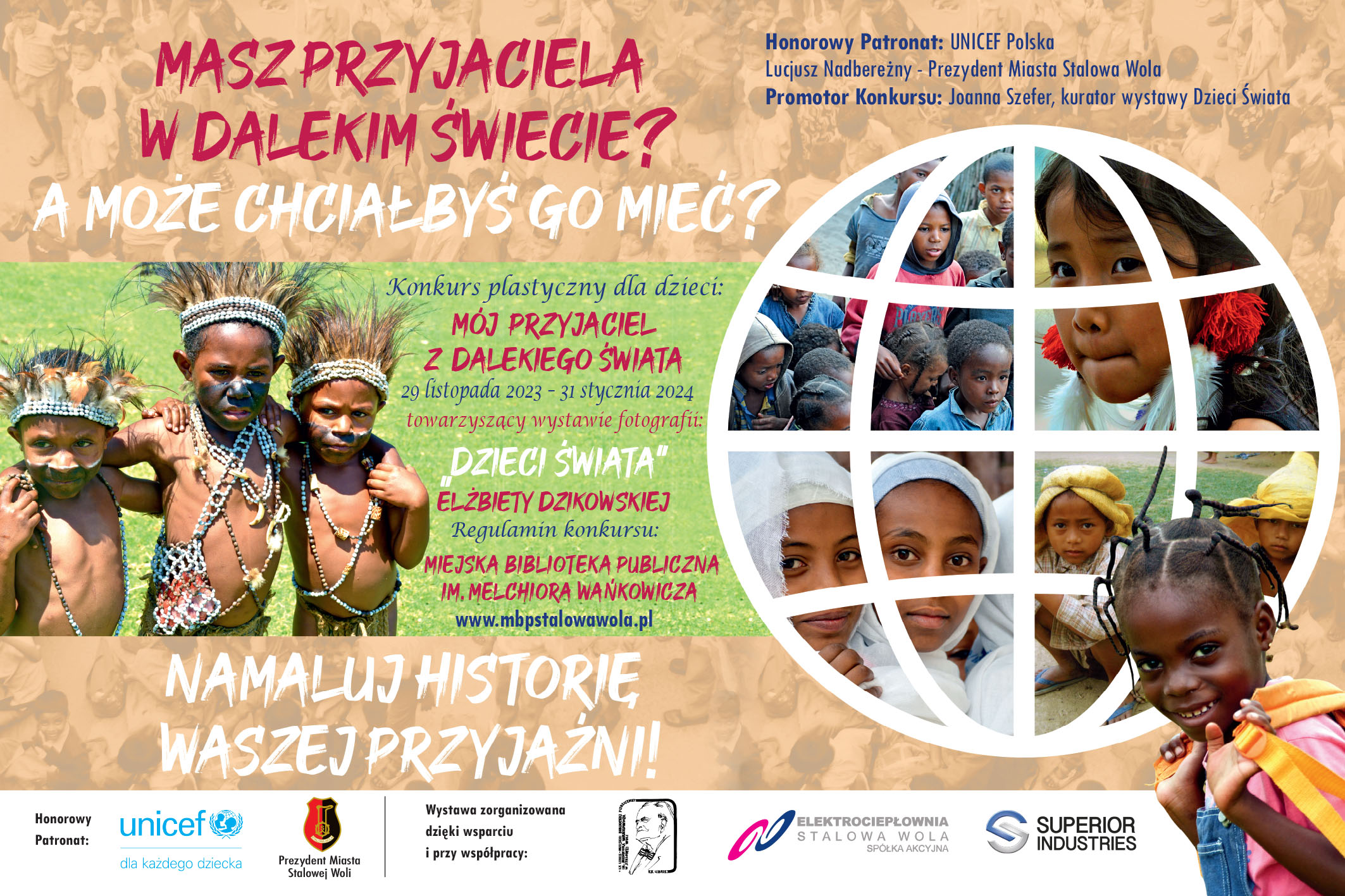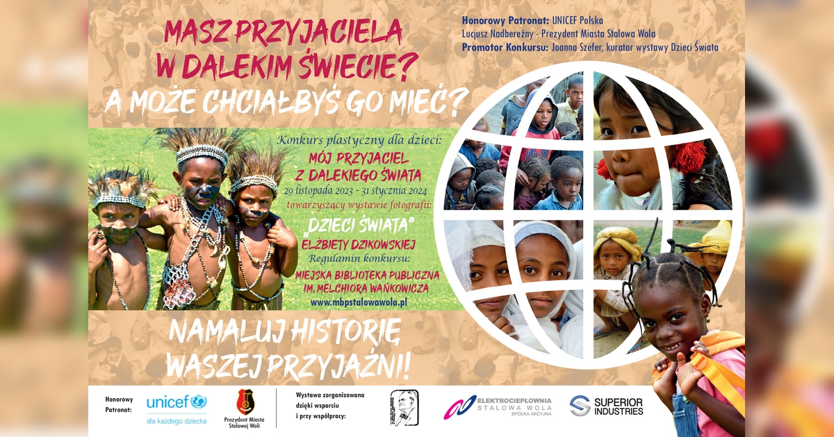 Miejska Biblioteka Publiczna im. Melchiora Wańkowicza w Stalowej Woli zaprasza serdecznie wszystkie dzieci ze Stalowej Woli i okolic do swojej siedziby na wystawę fotografii "Dzieci Świata" autorstwa Elżbiety Dzikowskiej. Wystawa, będąca hołdem dla różnorodności kulturowej i empatii, jest dostępna od 29 listopada 2023 do 12 stycznia 2024.